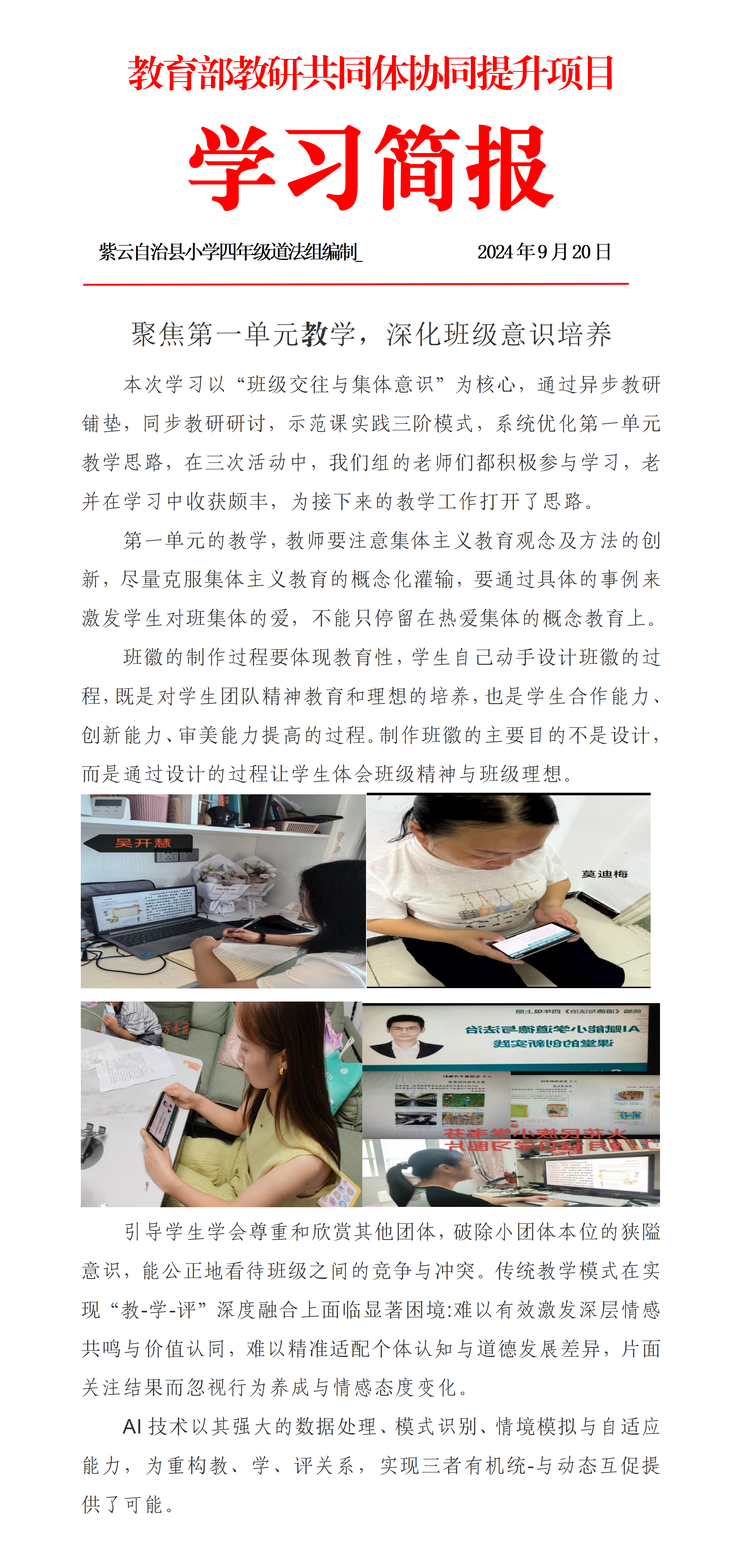 聚焦第一单元教学,深化班级意识培养——紫云县四年级道法教研共同体学习简报