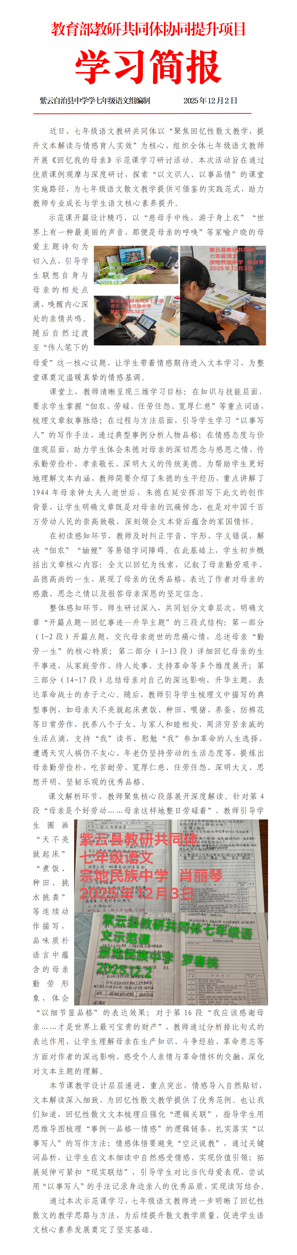 紫云自治县七年级语文学科《回忆我的母亲》示范课简报